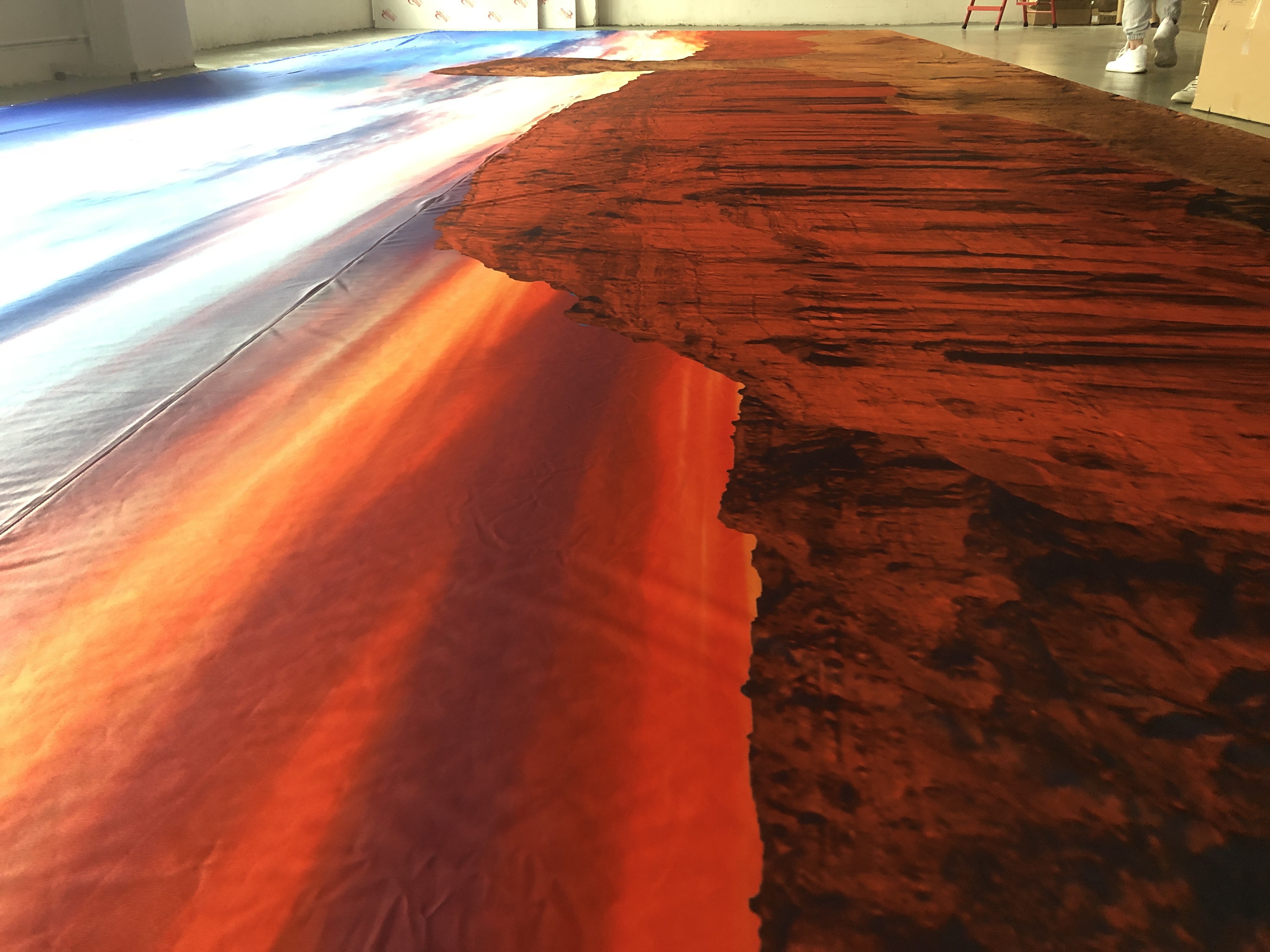 Solvent digital printed fabric: the ink sits on the surface coating of the fabric and most colors tend to appear muddy or muted in their vibrancy. Cracking in the ink is sometimes unavoidable. The heavy ink coverage can often cause the ink to scratch when folded too tightly. But with dye-sublimation inks the fabric is run through a heat calendar which, at 400 degree Fahrenheit temperature, causes the ink to convert to a gas. Thus, through a chemical reaction, the gas actually becomes part of the fabric!